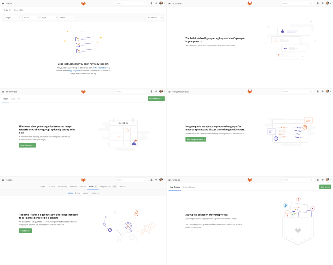 The navigation in the header is contextual to each page. These options change depending on if you are looking at a project, group, or settings page. There should be no more than 10 items on a level in the contextual navigation, allowing it to comfortably fit on a typical laptop screen. There can be up to too levels of navigation. Each sub nav group should be a self-contained group of functionality. For example, everything related to the issue tracker should be under the 'Issue' tab, while everything relating to the wiki will be grouped under the 'Wiki' tab. The names used for each section should be short and easy to remember, ideally 1-2 words in length.